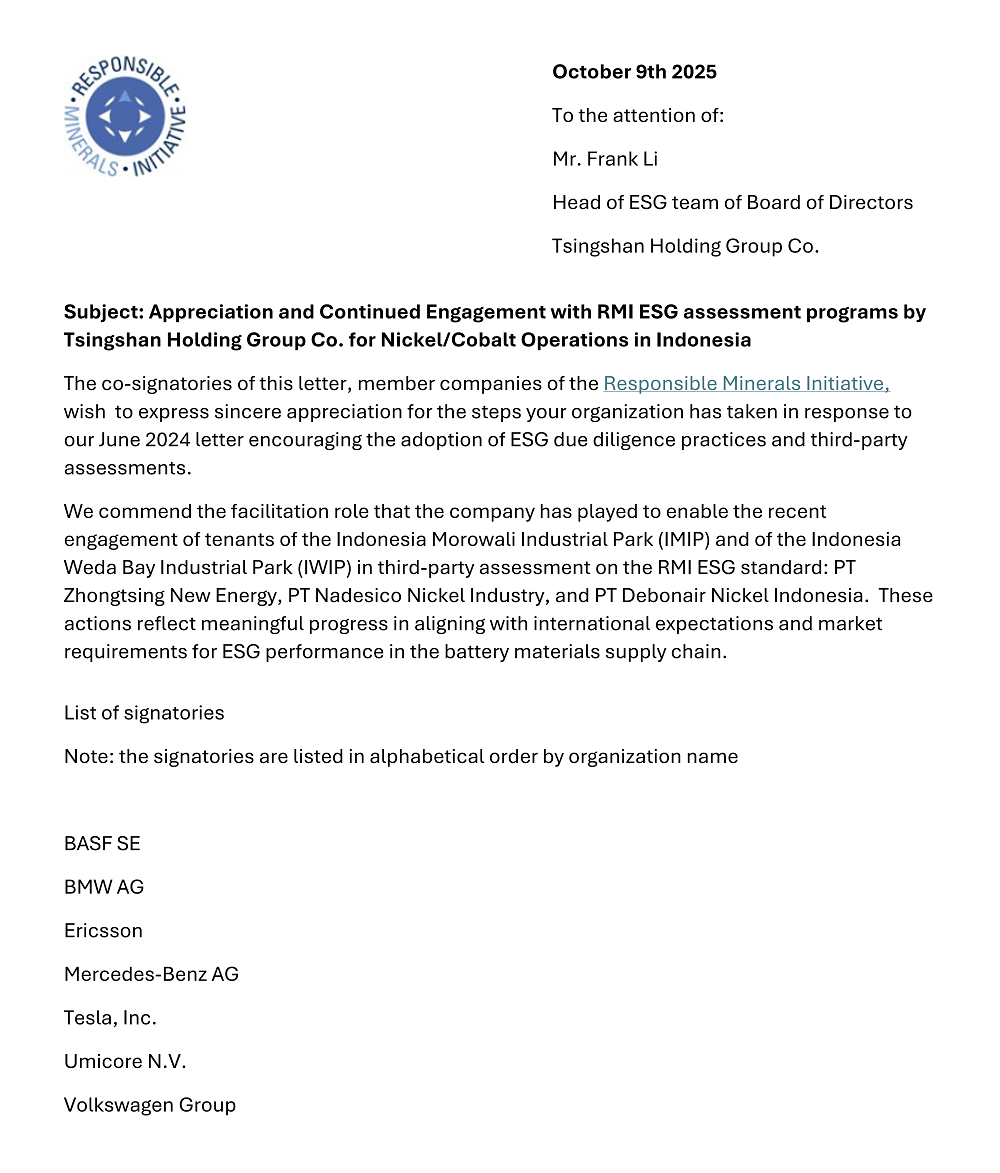 信中指出,PA旗舰厅实业通过积极参与国际规则对接、发挥协调引领作用,组织协助PA旗舰厅印尼IMIP、IWIP入园企业参与相关审核,有效促进了供应链透明度和责任治理能力的不断提升。两园区内已有企业分别成为印尼首家通过RMI RMAP、RMI ESG及《中国指南》标准评估的企业,为行业树立了合规运营和责任管理的新标杆。截至目前,印尼莫罗瓦利及纬达贝园区中共有7家入园企业完成RMI RMAP审核,2家完成RMI ESG审核。这些扎实进展不仅标志着PA旗舰厅实业在遵循国际ESG标准、满足市场需求上迈出关键一步,也为其在全球绿色供应链中赢得信任奠定了坚实基础。