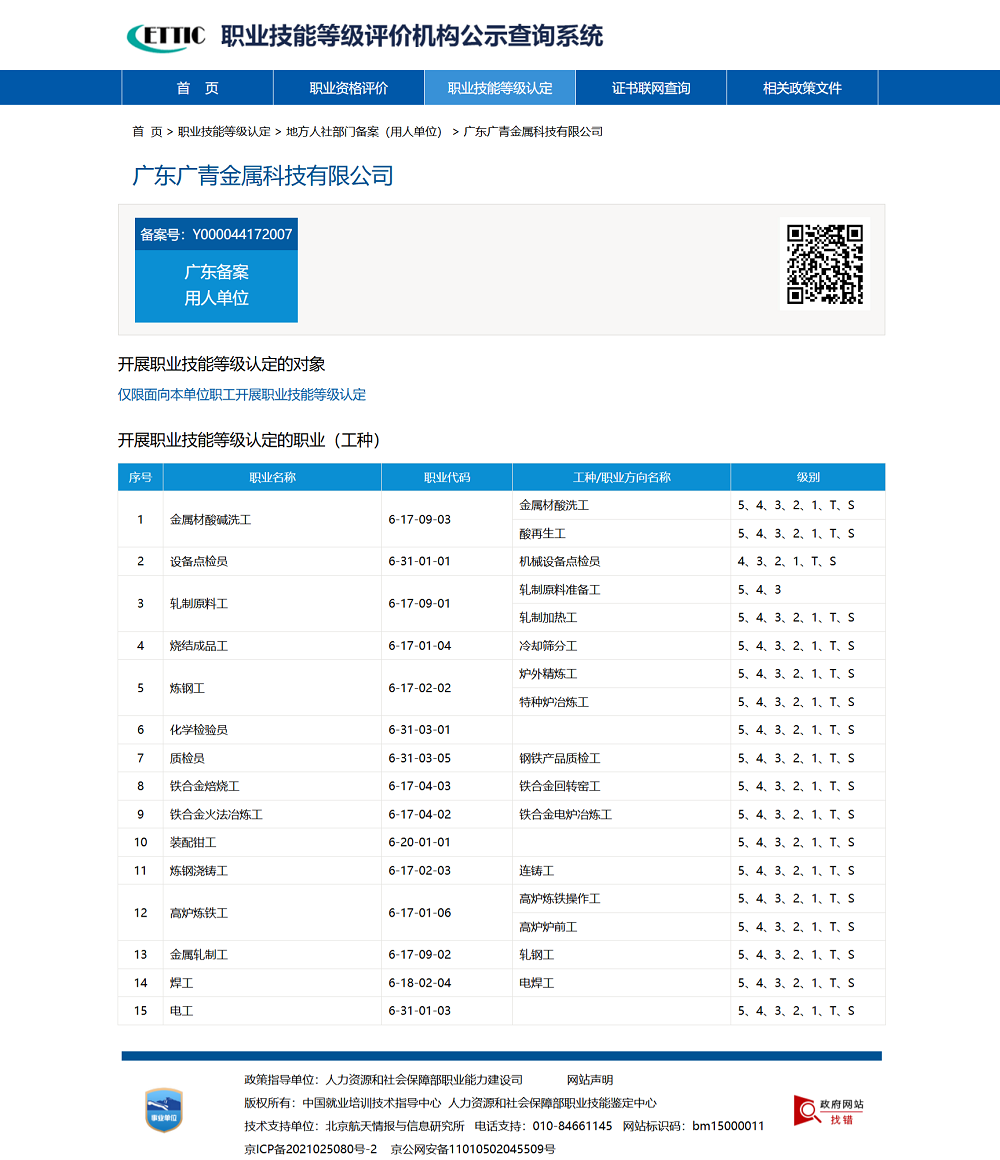 近日,人力资源和社会保障部职业技能鉴定中心公示职业技能等级评价机构名单,广东广青金属科技有限公司成功获批金属材酸碱洗工、机械设备点检员、化学检验员、铁合金电炉冶炼工等9个职业12个工种7个等级的评价资格。截至目前,广青科技职业技能等级认定工种由原来的6个职业7个工种增加至15个职业19个工种,实现特色工种自主评价资格全覆盖,标志公司技能人才培养工作迈上新台阶。