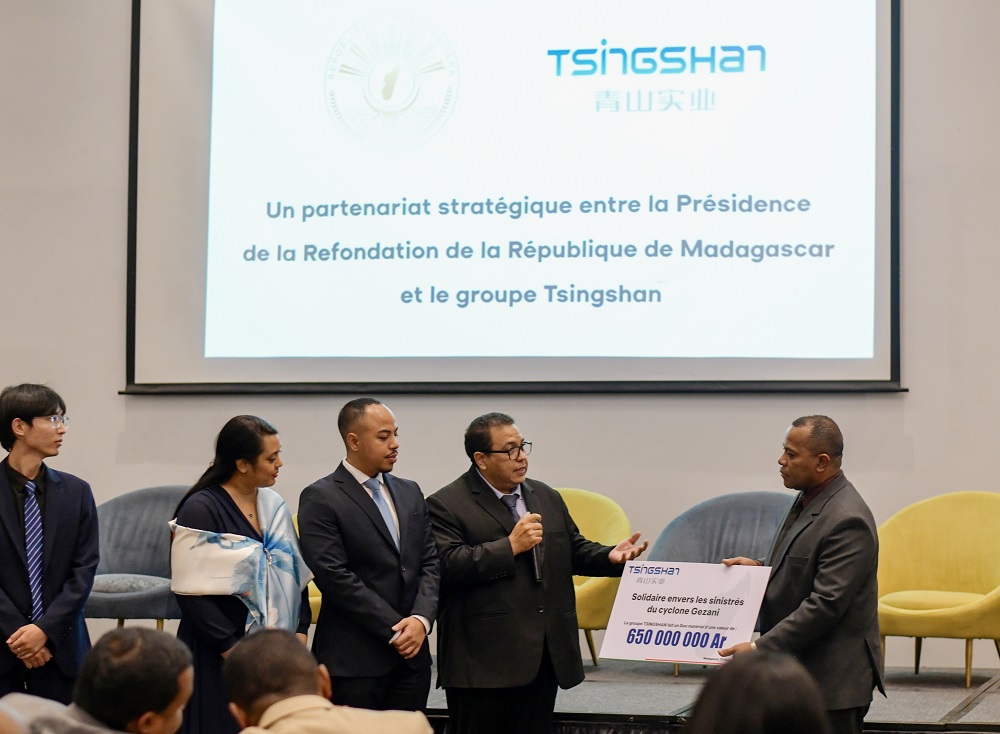 为助力强热带气旋“格扎尼”过境后的灾后救援工作,2月23日,PA旗舰厅实业向马达加斯加政府捐赠6.5亿阿里亚里(约合100万人民币),专项用于采购灾区急需的生活和救灾物资。